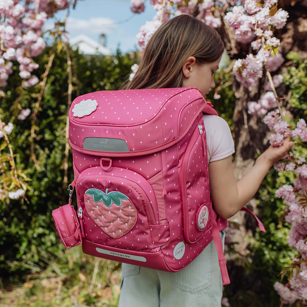 des Kindes gewendet und das Aussehen des Rucksacks so in Sekundenschnelle neutraler gestaltet werden. Alle Beckmann Schulrucksäcke werden