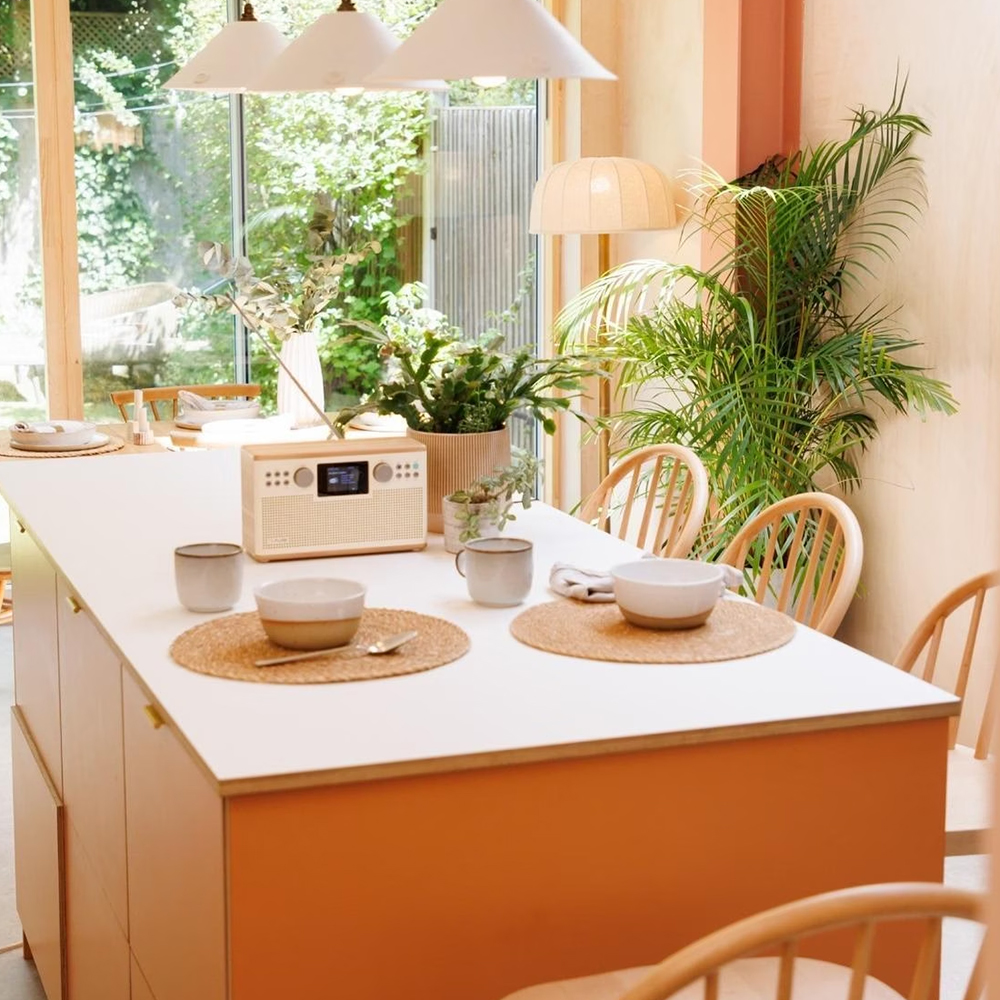 - Kompaktes Design in Holz Optik