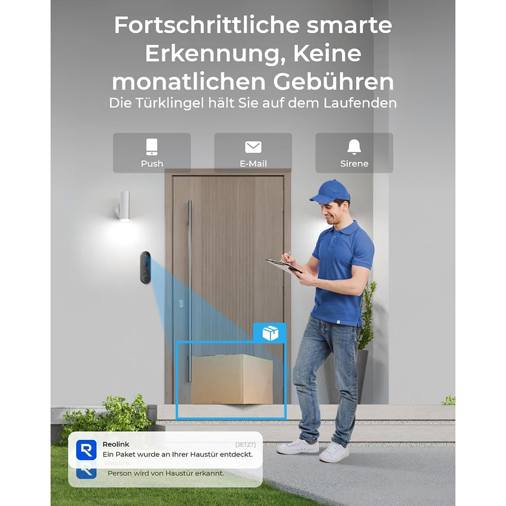 - Lieferumfang: Türklingel, Chime, Horizontaler Keil, Montageplatte, Starthilfekabel und Verlängerungskabel, USB Ladekabel, Bedienungsanleitung